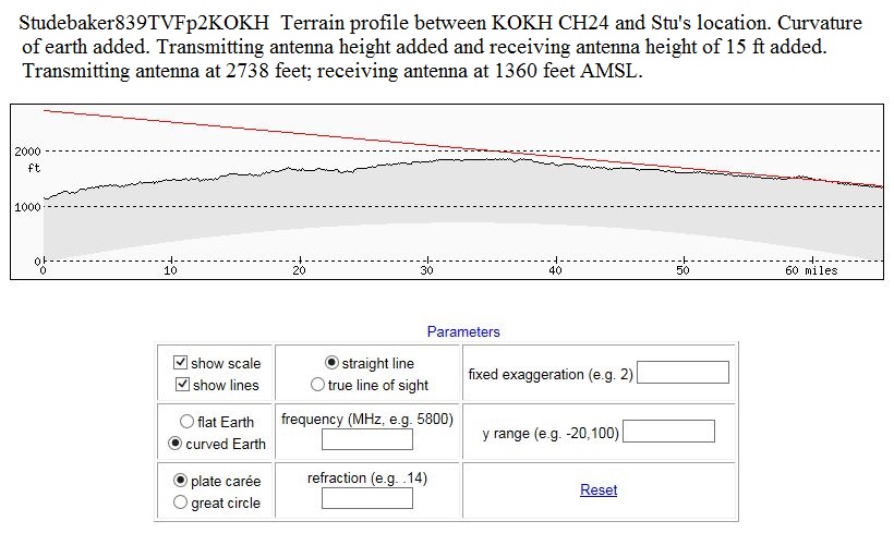 My TV fool report is the same. We are roughly 65 miles give or take from the broadcast stations. I'd say the antenna is about 15 ft up or so. We have an antennacraft HBU44 for antenna along with antennacraft 30db adjustable gain amp. It's split four ways, so roughly 100ft total to each outlet. I'm at the top of the chimney so it's as high as I can get it without going a different route as far as mounting a large pole (not a huge fan). Since I'm a novice especially with the tropospheric concept, would adjusting the angle help? Reception is poor for all channels (4, 5, 9, 25) during the afternoon hours.