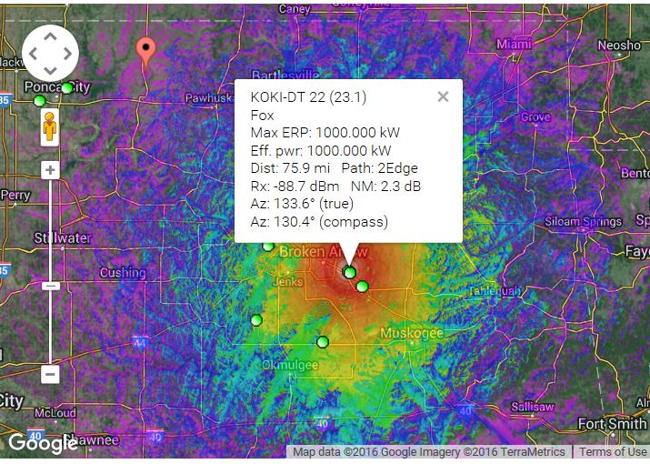 It's flat to the west of me and not as flat to the east. I'm about right dead on the dividing line between eastern and western Oklahoma. According to Google earth, there is a 500' elevation difference between me and Tulsa. TV Fool shows distance to be 76 miles, but Google Earth shows it more around 55-60 miles.