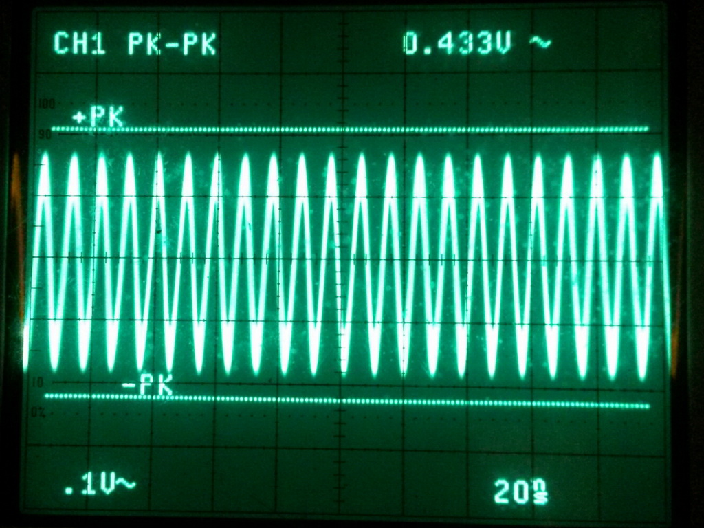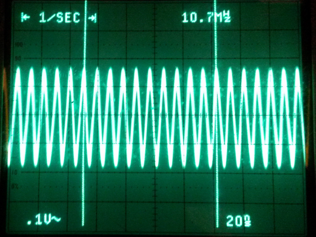 I was thinking earlier that I wish I had a Spectrum Analyzer. Then I wondered if anything would show up on an oscilloscope. It did and this should not be happening. That's 10 cycles marked so it's really showing 107MHz. But look at the voltage. That is straight off the coax.