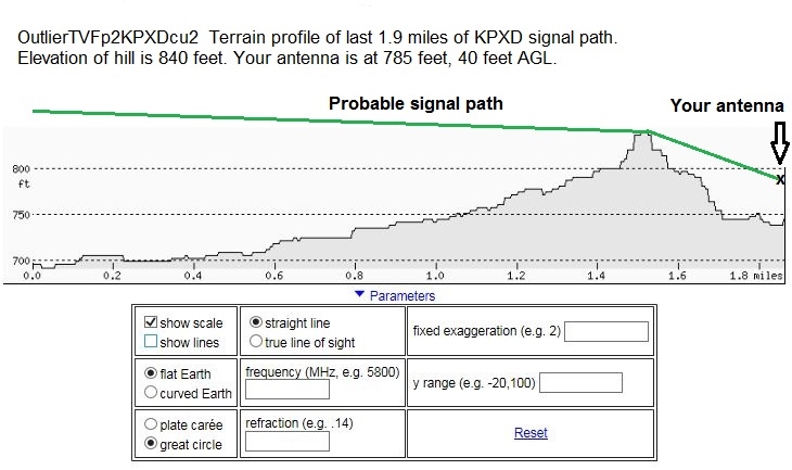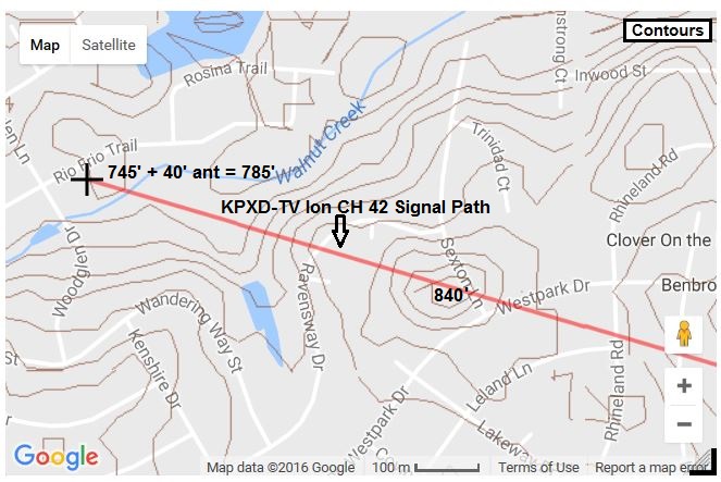Unfortunately, the new home is at the base of a hill. The hill is about 30 yards to my south and is between me and all the local TV transmitters. I'm located too close to the hill for line of sight to the transmitters. The part of the hill between the transmitters and me is about 12 meters above me.