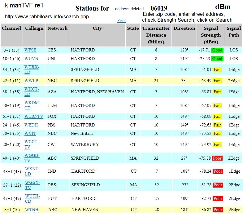 Another way of looking at signal strength is by Noise Margin (NM) as listed on your report. WFSB has a NM of 70.9 dB even before adding antenna gain, which puts it in the overload category.