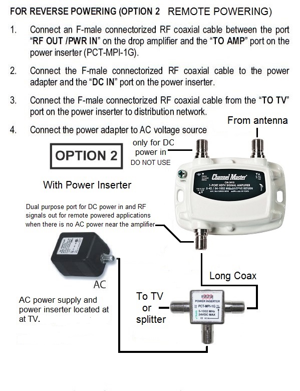 If you have AC power at the first splitter, the DC power for the Channel Master 3410 goes in the upper left port. If you do not have AC power at the first splitter, then you must provide remote DC power for the 3410 through the first 50' run using a power inserter just before the second splitter.