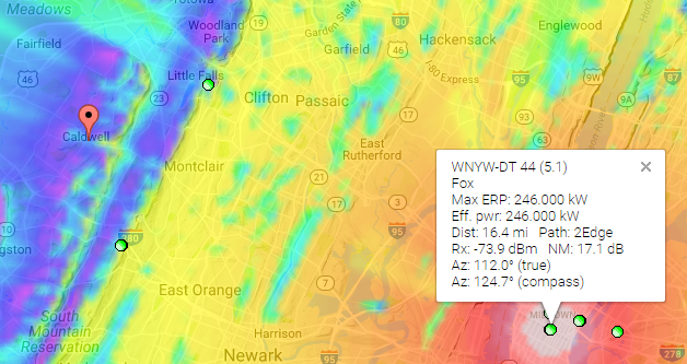 When I run the interactive tool report most stations are in the cyan and blue color area, including WPIX and WNYW. When the signal hits the first mountain here in NJ it goes from Red-yellow-green to cyan and blue. And I'm past the second mountain, which is all cyan and blue. Not good! I attached the interactive map for your reference. Still not sure why the other channels come in and not others if they originate from the same location.