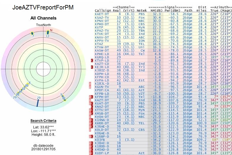 Hi, I'm in Fountain Hills AZ trying to get a reliable signal on Channel 12. I've got mountains and a neighbors house causing problems. Prior to the neighbors house being there I was getting a signal at a much lower height. Now 58' AGL gets it, 54' AGL doesn't. Antenna is currently down to about 33' AGL for maintenance and monsoon season. At 33' I lose Ch 3 (23) as well as 12. Antenna is a Winegard HD7698, 50' cable run to a Channel Plus DA-506BID DA to 4 TVs in the house. I just climbed off the tower to disconnect a Lime PA which Solid Signals had on sale, thought I'd give it a try. I could seen no difference in the system with the rudimentary signal strength meters at my disposal. In fact I lost Ch 5 (17), 60 mins didn't record last night. Thus I took the Juice PA off line. It looks like I need higher gain in at the antenna level. This is a PM because I see you're from AZ and have had some insightful posts. I can't post to the forum, I applied 4 weeks ago but haven't been activated yet which is a bit frustrating. I'm getting ready to put the antenna back up (with new guy wires, that and the monsoons inspired me to take it down to 33') I'd love to get the experts insights as to how I might be able to increase my antenna gain but it's football season so the antenna needs to get back up. :-) By the way, I can't get 3 (24) at 33' but I can get Tucson 4 (23), go figure. :-) Thanks in advance for any light you can shed on this.