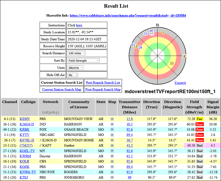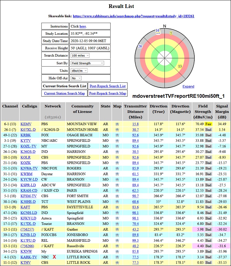 Wow! That's a lot of information there. Very interesting! Just for giggles, would you mind making one of those reports for a Little Rock channel? I guess pick KARK since that was one he was wanting to receive. I'm kind of curious to find out where the Little Rock stations are being completely blocked.