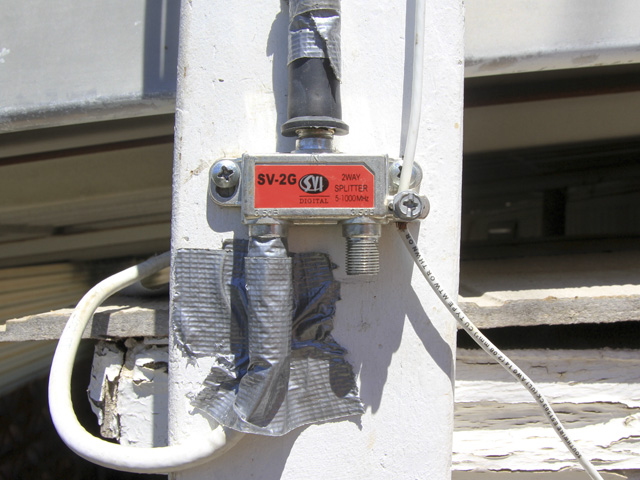 You are great. Thanks for the input. I have attached a picture of my splitter ground block. I don't recall seeing the straight through ground at Fry's but have seen it elsewhere. Being at Fry's and thinking I might give feed to my landlord and emmm.... assuming that the connections for coax to grnd blks were basically the same I went with it. I can go out and grab the straight one thus eliminating some of that loss. Thank you Rabbit and Ground. Ground your comment about waterproofing is appreciated. My ground block is out doors right where the feed wire runs off through the car port at about 9' high. I have the wire attached to a 6" bolt connected to and sticking above my antenna run to and thru the block (by stripping 3/4" there) and then continuing on another 8' to a ground block on my service panel. Those are not water proofed so I thought I did not need to waterproof the antenna block.