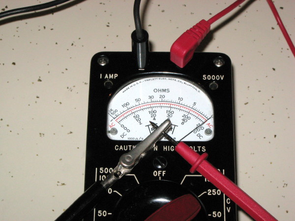 Attachment No. 1 shows my ohmmeter with the probes connected together for a short circuit. The OHMS scale reads zero ohms. Note that for the ohms scale ZERO is at the right end and open circuit is at the left end with an infinity symbol.