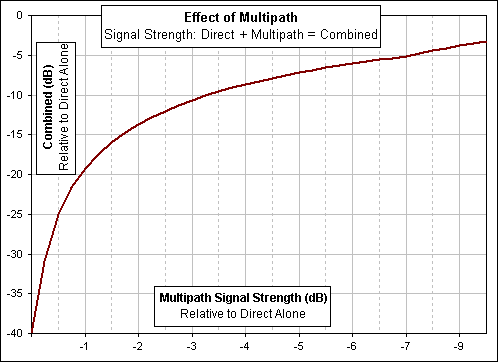 In the graph, as an example observe the curve at 25 dB. A 25 dB null can occur if the reflected signal has amplitude that is only ~0.5 dB lower than the direct signal. The greater the difference in amplitudes of the two signals, then the shallower the null will be. For example if the multipath signal is about ~10 dB weaker than the direct signal, then the combination may be reduced about 3 dB.