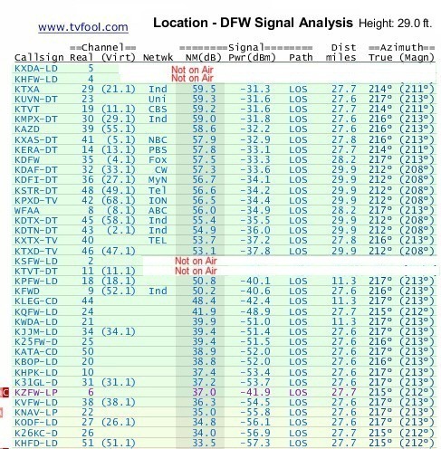 3. Align antenna for peak signal on Channel 29 (~central angle to DFW stations)