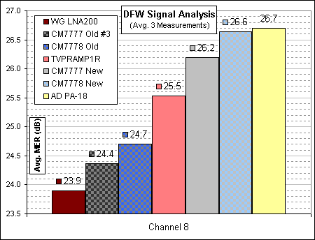 Signal measurements from several preamplifiers were compared, while receiving selected UHF channels and one VHF channel in the Dallas Fort Worth area.