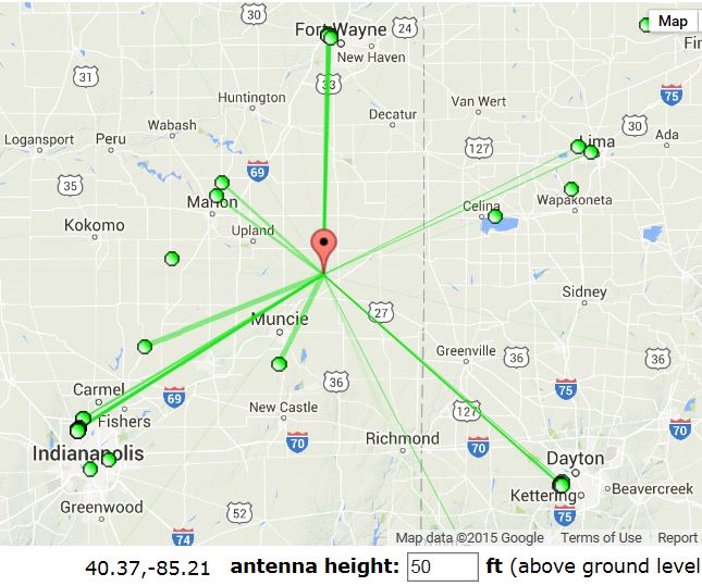 Just for reference, the stations that are almost perfectly due north are mostly from Fort Wayne, Indiana. The stations in the southwest quadrant are a mix of a couple of nearby cities (in the green) and then Indianapolis in the yellow/red. In the southeastern quadrant, in the red, are stations from Dayton.