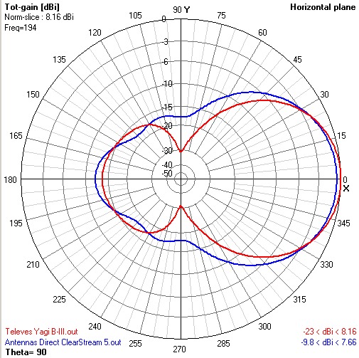 The Antennas Direct ClearStream 5 (C5) and Televes Yagi BIII provided nearly the same average signal strength for Channel 8 and 9, with an approximately 0.1 dB advantage for the Televes antenna.  Since 0.1 dB is near the measurement accuracy limits of the test configuration, the difference may not be very significant.