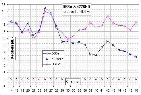 If the above graph were accurate for every channel (which is doubtful), one could add the gain of the HDTVi to every antenna, to obtain a total gain figures. Previous calculations  show the gain of the HDTVi to be about 6.5-7 dBi.