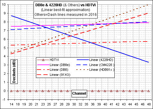 It appears that the older CM4228 (non-HD) is a fairly good match to the newer DB8e, both show a wideband response with relatively high gain at the lower channels.