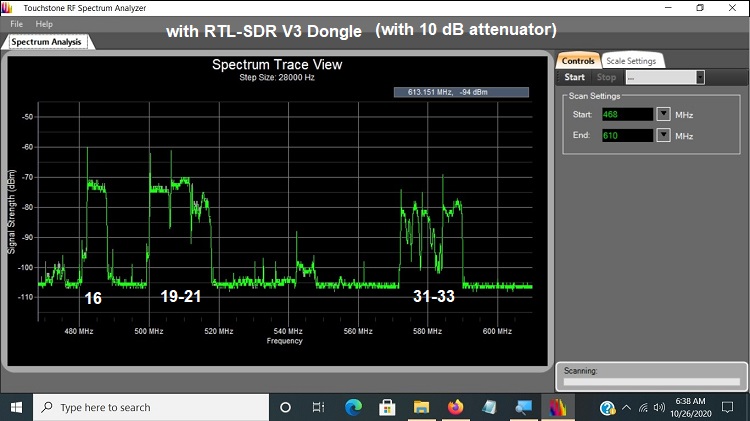 To find the signal strength of Channel 20, I added the attenuator setting to the average tuner dropout point of -85 dBm:
