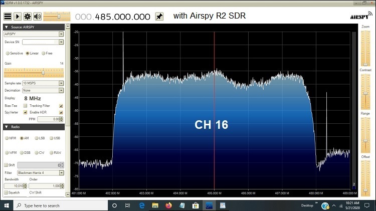 Originally Posted by tripelo  Can the Airspy not scan & display a narrow 8-10 MHz region like the RSP1? |  The Airspy R2 can scan 8 MHz with the SDR# software, similar to what the RSP1A does with the SDRuno software. It is important to set the gain at the correct level to obtain the proper presentation of the SNR; too much or too little will show the wrong SNR. Increase gain until the adjacent noise floor just starts to rise and the signal no longer increases in strength. That point should show MAX SNR.