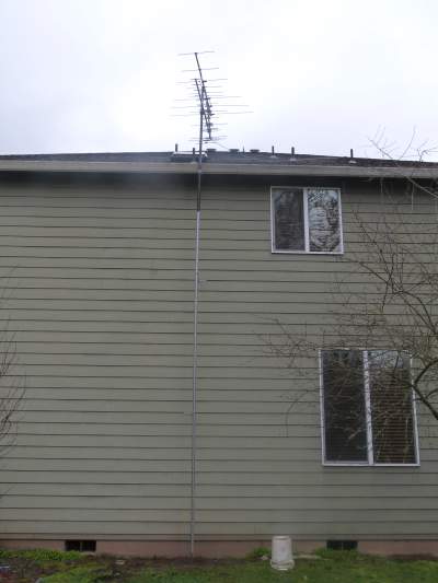 I then move the antenna from the garage keeping it on the 70" pipe stock and dropped it into the new pole, aimed 208-210 degrees and set using a self tapping screw. Attached new 100' triple shielded coax to the antenna and through a lead line over the top of the house and pulled it to the box on the north side of the garage, anchored with coax screw fittings, fed into the box.