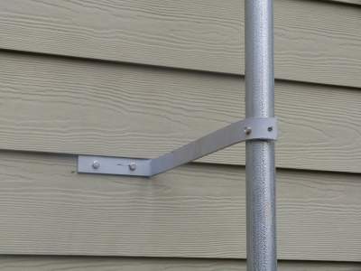 Set the first brace against the house, marked with red felt tip pen and predrilled pilot holes through the siding (Hardiplank). Sprayed the back of the L on each bracket with a rubberized material. Primed the plate stock so it wouldn't rust. Using stainless steel 1 1/2" 14's I attached the bracket to the house and then using self tapping screw attached the C to the pole (where I had bent it).