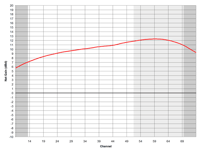 - This antenna gets between 6 and 13 dBd at different points within the UHF band.