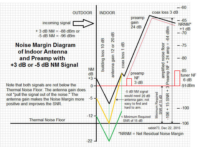 (Note that his scenario assumes that the gain of the pre-amp is more than enough to overcome the losses of the cable, splitter, and receiver noise figure that come after it in the chain.)