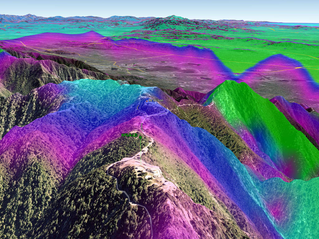 From the transmitter's vantage point, Mt. Wilson (in the middle of the image below) and Mt. Harvard (smaller peak to the right) become major obstructions that affect communities to the east (blocked by Mt. Wilson) and to the south (blocked by Mt. Harvard).