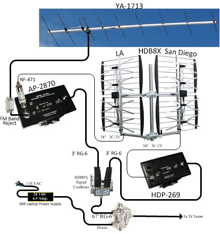 Fortunately, I have two runs of coax going to the push-up. I setup 2 power inserters in the garage and combined their output signals. At the mast I hooked my Winegard HDP-269 to the San Diego panel and my Winegard AP-2870 to the LA panel. I connected the Winegard YA-1713 through an Antennas Direct -20 dB FM trap to the AP-2870 VHF input. Things got a little better but I was still missing channels and sometimes would have to retune several times to get lock on a channel.