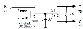 A gentleman on the digital home forum (holl_ands) identified the combiner picture that 329049 posted as a “Magic Tee” and posted several links for me to bone up on Magic Tee theory & design. 329049’s would basically be the T2 portion of the Mini-Circuits diagram that you posted and appears to be missing the port-to-port (2 X R) 150 ohm mis-match dissipation resistor (RINT). According to what I read, the 75 ohms on each input port should transform to 37.5 ohms @ the combiner’s output, necessitating the output impedance matching auto transformer T1 (also missing from 329049’s combiner). The only way I could tell if my model has a resistor across the windings would be to de-solder the metal cover, since a 150 ohm resistor in parallel with a couple of inches of wire is going to appear as a short to an ohm meter. Based on my continuity measurements, I can tell that mine doesn’t have a grounded auto transformer on the output side but maybe if I’m lucky its designed something like this: