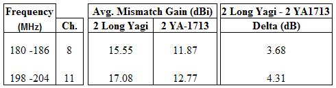 The following plot shows the mismatched gain for both the stacked pair of YA-1713 and the stacked pair of long Yagis.