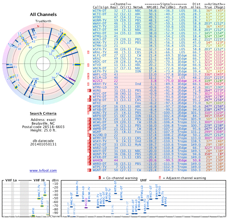 Also, I mentioned high-VHF. Do you want ABC WCTI (RF 12) Greenville, CBS WNCT (RF 10) Greenville and ABC WTVD (RF 11) from Raleigh? If so adding a high-VHF antenna to work in concert with your 4228 will likely yield you stable results of RF 10, 11 and 12. You may see them with the 4228, but results might be unstable due to the 4228 not being designed for high-VHF.