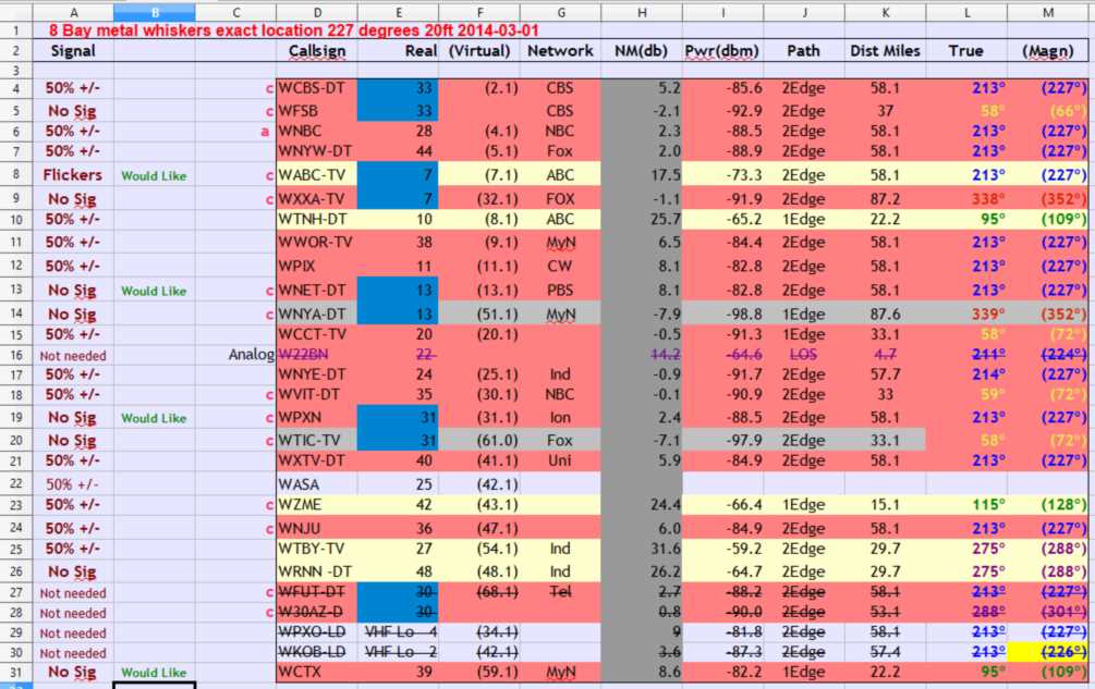 To fine tune antenna aim and aim antenna at Tv stations that are not received with antenna aimed at about 227 degree magnetic compass direction.