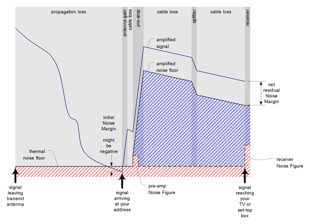 (Note that his scenario assumes that the gain of the pre-amp is more than enough to overcome the losses of the cable, splitter, and receiver noise figure that come after it in the chain.)