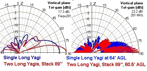 Computer simulations with 4NEC2 software provides for graphing the vertical beam pattern of antennas. The horizon is shown on the 4NEC2 graphs as 90 degrees. The image below shows on the left, the upper half-pattern in free space of a single long-Yagi; overlaid is a stack at 89 inches.