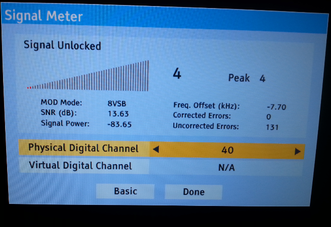 Thanks for all the input. I have experimented with moving the antenna around up/down, side to side, etc as well pointing it different directions. The only real effect I can see is pointing different degree heading. Right at 300 seems to bring in everything but 40. My TV is telling me the signal strength is about -84dB whereas most everything else shows as -69 to 70dB range. I'm getting the feeling I need a bigger antenna to strengthen the signal from that station.