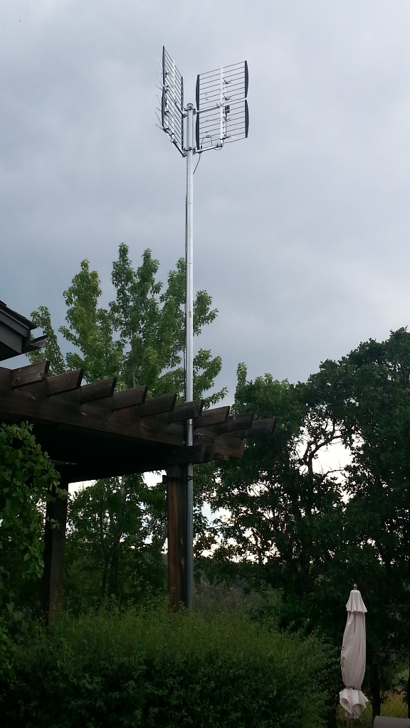 So a couple weeks back we rigged up a mast using two 10ft sections of 2 inch threaded EMT conduit. This might be a bit of overkill so I may switch it out to 1 1/4 or 1 1/2 inch. Then we set an HDB8X antenna up and am getting all the channels I'm supposed to.