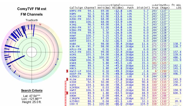 If you click on a callsign in your report you will see the terrain profile which shows the interference from the terrain. You will also see that out of the Maximum ERP of 960.000 kW for NBC, only 163.653 kW reaches you. The transmitter is at the left end of the profile, your location is at the right.