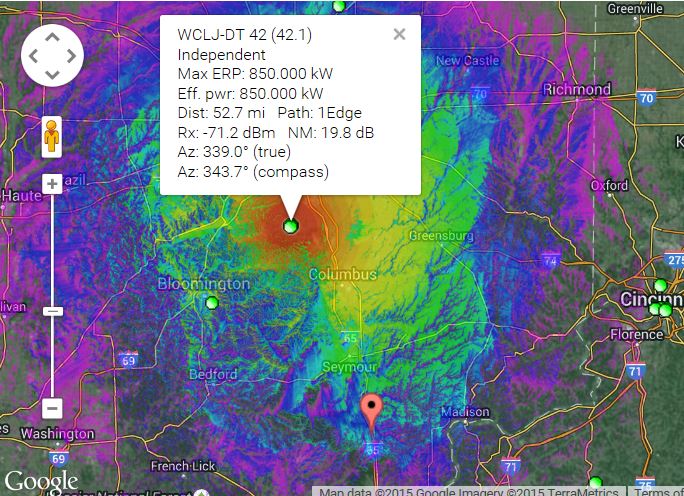 Thanks for responding rabbit73. I can answer some of your questions now but have to get to an appointment and will follow up later. Here is my new report after I measured and got 25’ to bottom edge of lower antenna. http://www.tvfool.com/?option=com_wr...8e03367320af70 Actually I am about 1/8 mile north of the Walmart and 1/8 mile West of Goat Milk Stuff in Scottsburg. I am in a subdivision with only a few trees, I have a tree close to the antenna on the East side but not blocking the aim I don’t think, no thick tree growth South of the antenna for at least 1/8 to ¼ mile. I will need to get on top of the house to check but I am sure I connected the 2 antennas with a combiner not a splitter. My knowledge of this topic is not at all technical so I am unsure exactly what a UVSJ is. Is there a simple way for me to determine if the U8000 is modified to make it bi-directional as I had the antennas installed by a local electrician about 4 years ago and I simply do not know. Can I attach a photo and if so would this be helpful? The CPA19 did bring in the PBS stations but for some reason WAVE channel 3 was always a problem. Now with Juice pre amp WAVE 3 is great and PBS is very poor or no signal. There are no other buildings close by other than private homes. The wind over time may have rotated the antennas if that is possible? I don’t know the exact direction the antennas are aimed until I get on the roof to check although they are generally South and a few degrees to the West I think. Hopefully this can help some.