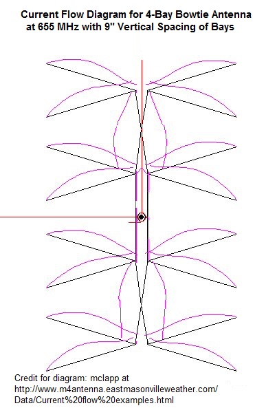 Here you see the collinear array with straight wire elements. The >< shape "whiskers" make the bowtie antenna even more broadbanded.
