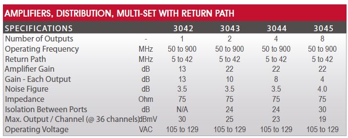 The CM 3044 is an old distribution amp that has a gain of 22 dB, but each of the 4 outputs is only up 8 dB which doesn't compute in today's terms. Must be a high loss split as compared to the CM 3414.