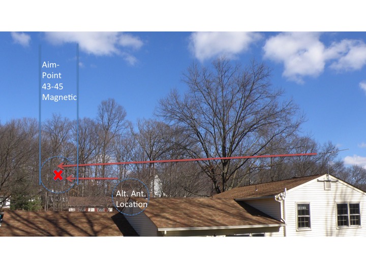 I have attached a "photo" (Antenna Placement Options) showing the current antenna installation and the optional / alternate location. This photo shows the challenges I have with both nearby and more distant trees that obstruct signal reception. I do realize that it is currently winter and there are no leaves on these trees.