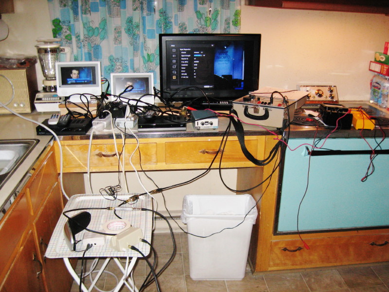 One time I did a test setup with the antenna and preamp connected to a 4-way splitter and then to two converter boxes, two 8-inch monitors, a Sony 22-inch LCD TV, and signal level meter. This was a temporary setup to compare the sensitivity of the tuners using a step attenuator to bring the signals to the digital cliff. The antenna coax was not grounded.