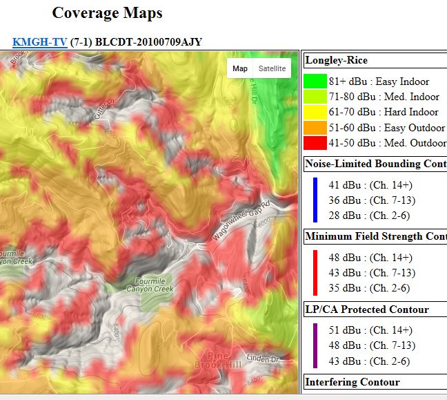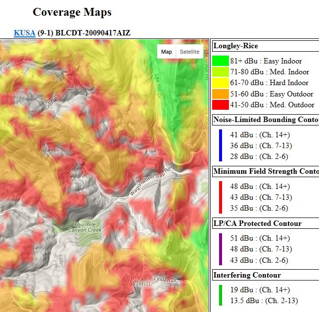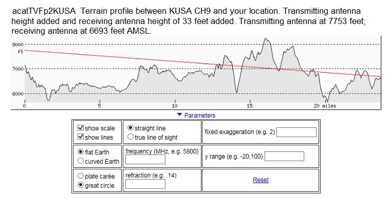 In addition, the terrain between Denver and your location has peaks that will block TV signals. If you click on a callsign in your report you will see a terrain profile. The transmitter is on the left, and your location is on the right.