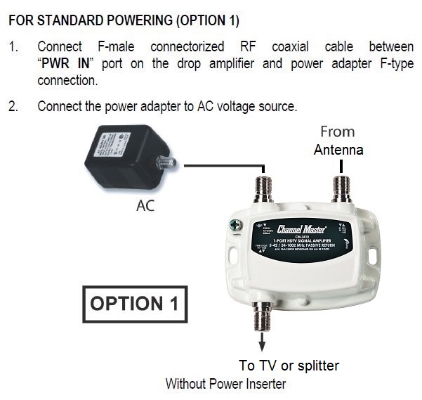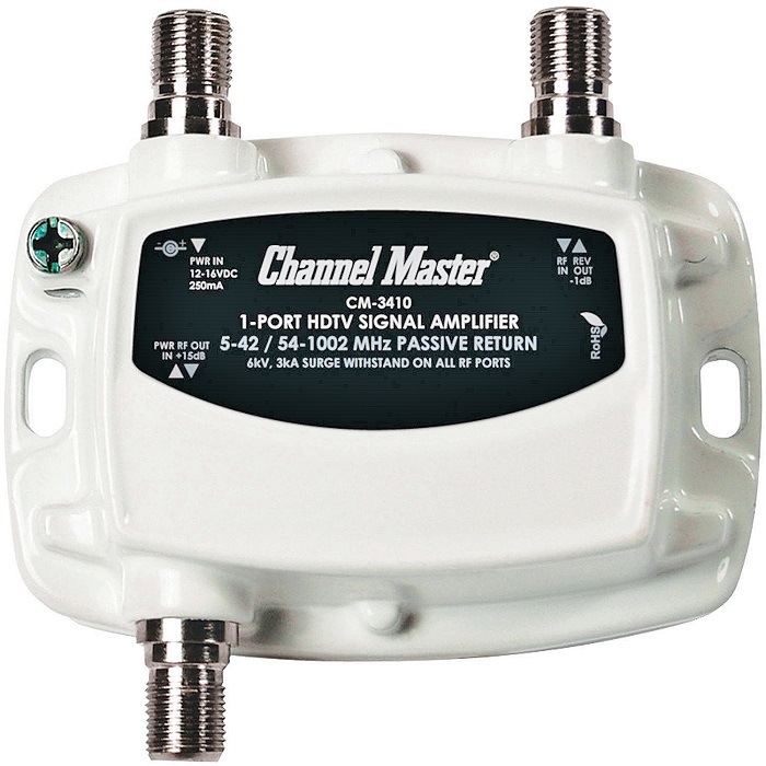 If you have AC power at the first splitter, the DC power for the Channel Master 3410 goes in the upper left port. If you do not have AC power at the first splitter, then you must provide remote DC power for the 3410 through the first 50' run using a power inserter just before the second splitter.
