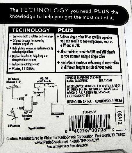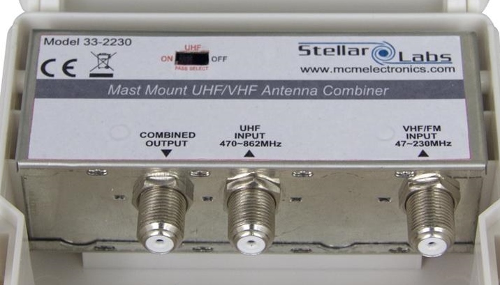 The common use these days is to combine a UHF antenna with a VHF antenna for the single input of current TVs, but the UVSJ is a reciprocal device that can be used to combine UHF and VHF signals OR separate UHF and VHF signals.