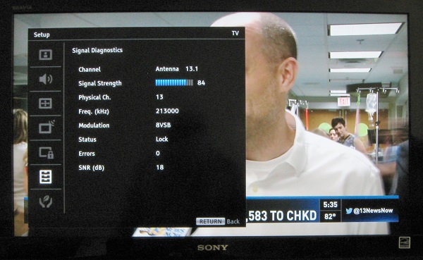 I found a convenient location in the bedroom for the antenna and made some measurements. In this location, CH 13 is picked up by the tuner, but there is picture freeze and many uncorrected errors, not too good: