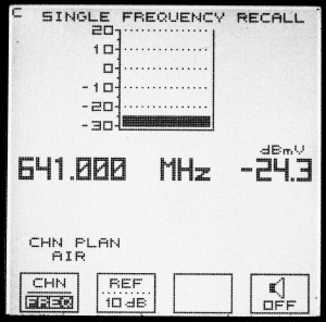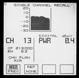 The Sadelco DislayMax 800 signal level meter makes 43 measurements across the channel and diplays the average of all readings. If one of the 43 measurements is below -20 dBmV, the meter says "Ur" for under range and doesn't give a reading. The scan covers about 5.3 MHz of the 6 MHz channel.