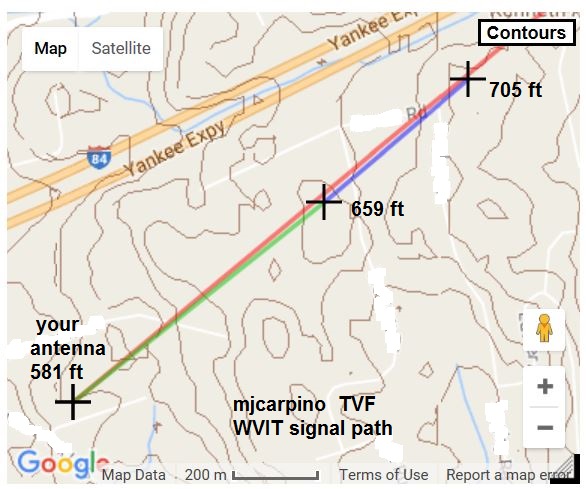 jrgagne99 has some doubts about the accuracy of the software. In his case, it shows a hill in the signal path that he says isn't there. I think what happened in his case, there is a tall stand of trees in the signal path that was read as an increase in elevation. The elevation readings were probably done by aerial survey, which might include the height of the trees. Years ago, elevation was measured on the ground from benchmarks. In the final analysis, it's just as damaging to the signal as a hill.