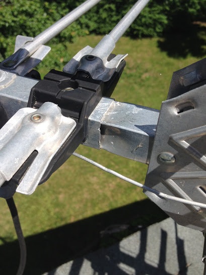 I am wondering if the connection between the UHF and VHF elements on the antenna is the issue - see pic.