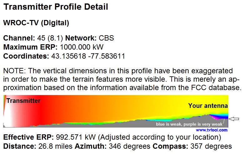 Here is a report for Mt Morris. The Rochester signals aren't very strong, but WPXJ ION from Pavilion is strong enough to use as a test signal with a simple test antenna, if that is your location.