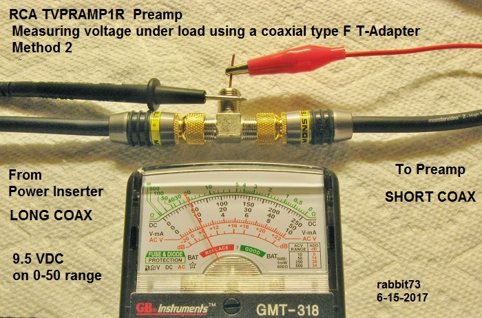 And you haven't checked the voltage to the preamp at the upper end of the coax when it is connected to the preamp. This is harder, because when you check the voltage to the preamp near the preamp when it is connected, you need access to the center conductor. I use a T-adapter for that: