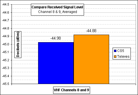 An average 9 measurements of each channel (8 & 9) for each antenna (ClearStream 5 and Televes Yagi BIII).
